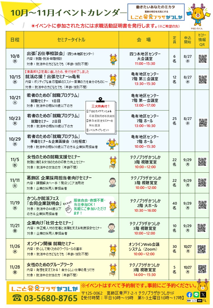 10月は当所専属の就職相談員が四つ木地区センターに出張して「お仕事相談会」を行います。また、39歳以下の若者を対象にした「就職セミナー&面接会」も開催予定です。2日間のセミナーを受講後、企業面接会に参加することができます。